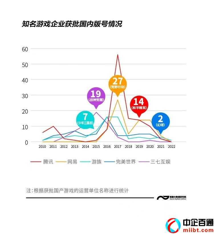 如何獲得騰訊、網(wǎng)易等知名游戲企業(yè)的游戲版號(hào)?梳理發(fā)現(xiàn),自2010年以來,騰訊已經(jīng)獲得了120多款國產(chǎn)游戲的版號(hào)。其中,2017年獲批的游戲數(shù)量最多,超過50款,但超過一半是麻將游戲,如QQ廣西麻將、QQ廣東麻將、QQ江西麻將等。然而,射擊競技手機(jī)游戲和平精英在2019年獲得了版號(hào)。同樣,2017年網(wǎng)易獲批的國產(chǎn)游戲數(shù)量也最多,涉及荒野行動(dòng)等27款游戲。