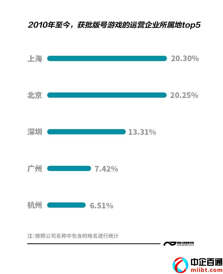 這些獲批的游戲來自哪些城市?梳理發(fā)現(xiàn),2010年以來獲批的2萬多款國產(chǎn)游戲中,上海、北京、深圳、廣州、杭州的游戲運(yùn)營單位超過65%。其中,上海和北京的企業(yè)占比超過20%。