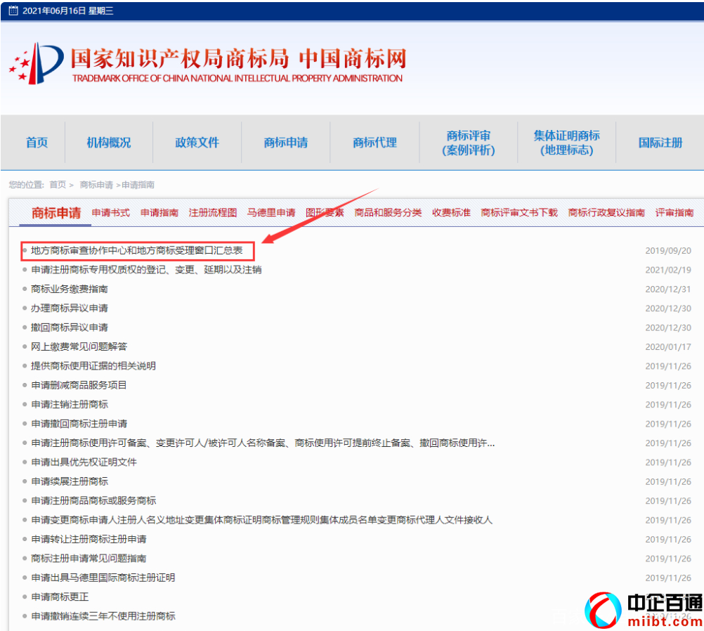 四、操作步驟和上面差不多,進(jìn)入商標(biāo)局官網(wǎng),點(diǎn)擊“商標(biāo)申請(qǐng)指南”,找到 “地方商標(biāo)審查協(xié)作中心和地方商標(biāo)受理窗口匯總表”,你就可以查詢你所在的省市有沒(méi)有商標(biāo)辦理的窗口了。