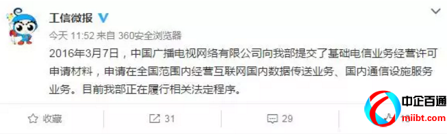 據(jù)工業(yè)和信息化部信息中心官方微博消息,3月7日中國廣播電視網(wǎng)絡有限公司(以下簡稱“中國廣電”)已向工信部提交了基礎電信業(yè)務經(jīng)營許可申請材料,申請在全國范圍內(nèi)經(jīng)營互聯(lián)網(wǎng)國內(nèi)數(shù)據(jù)傳送業(yè)務(