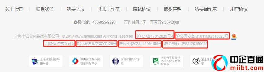 舉個例子,如果公司計劃開展小說類業(yè)務(wù),首先我們可以通過查看當(dāng)前行業(yè)內(nèi)的大型公司,了解他們所具備的資質(zhì)。比如,我們可以訪問一些知名小說平臺的官網(wǎng),像“七貓小說”這樣的大型公司。打開其官網(wǎng),拉到頁面的最下方,你會看到列出的全部資質(zhì)。通過這些資質(zhì)信息,我們可以了解小說類業(yè)務(wù)所需要的關(guān)鍵許可證和資質(zhì)。