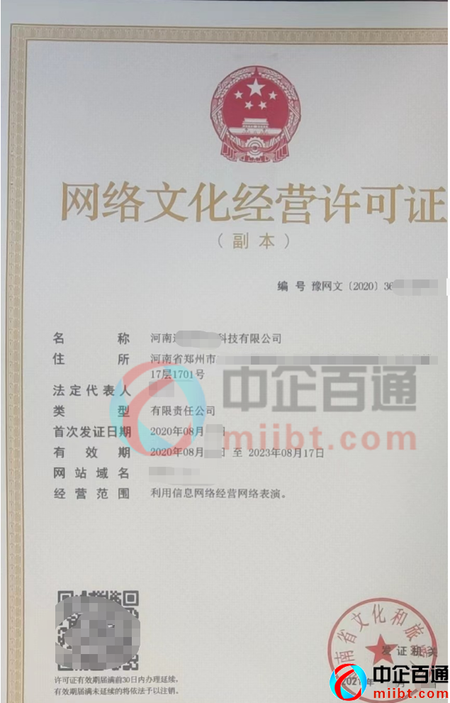 河南鄭州2020年8月直播表演文網(wǎng)文許可證樣例