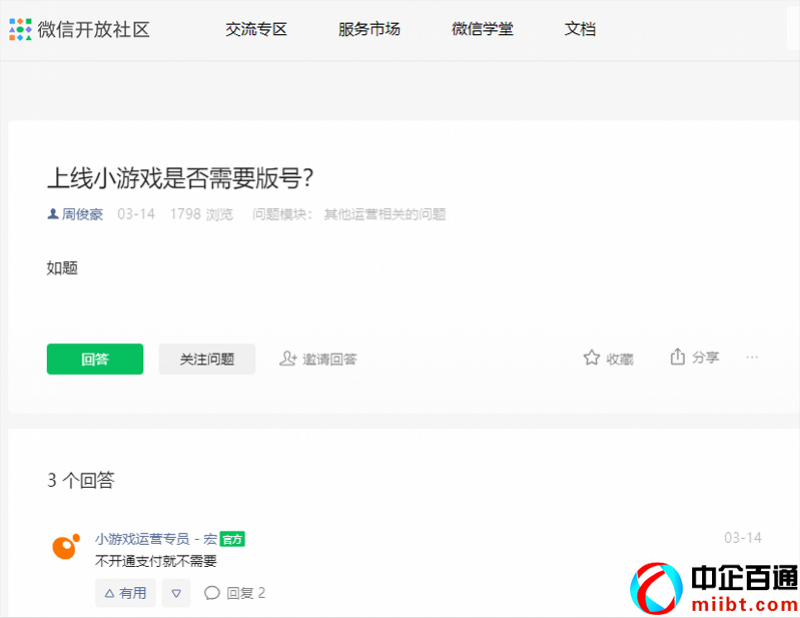 值得注意的是,今年3月,在微信開(kāi)放社區(qū)中有“上線小游戲是否需要版號(hào)?”的提問(wèn)。在評(píng)論區(qū),有帶有“官方”標(biāo)識(shí)的小游戲運(yùn)營(yíng)專員回復(fù)稱:“不開(kāi)通支付就不需要”。