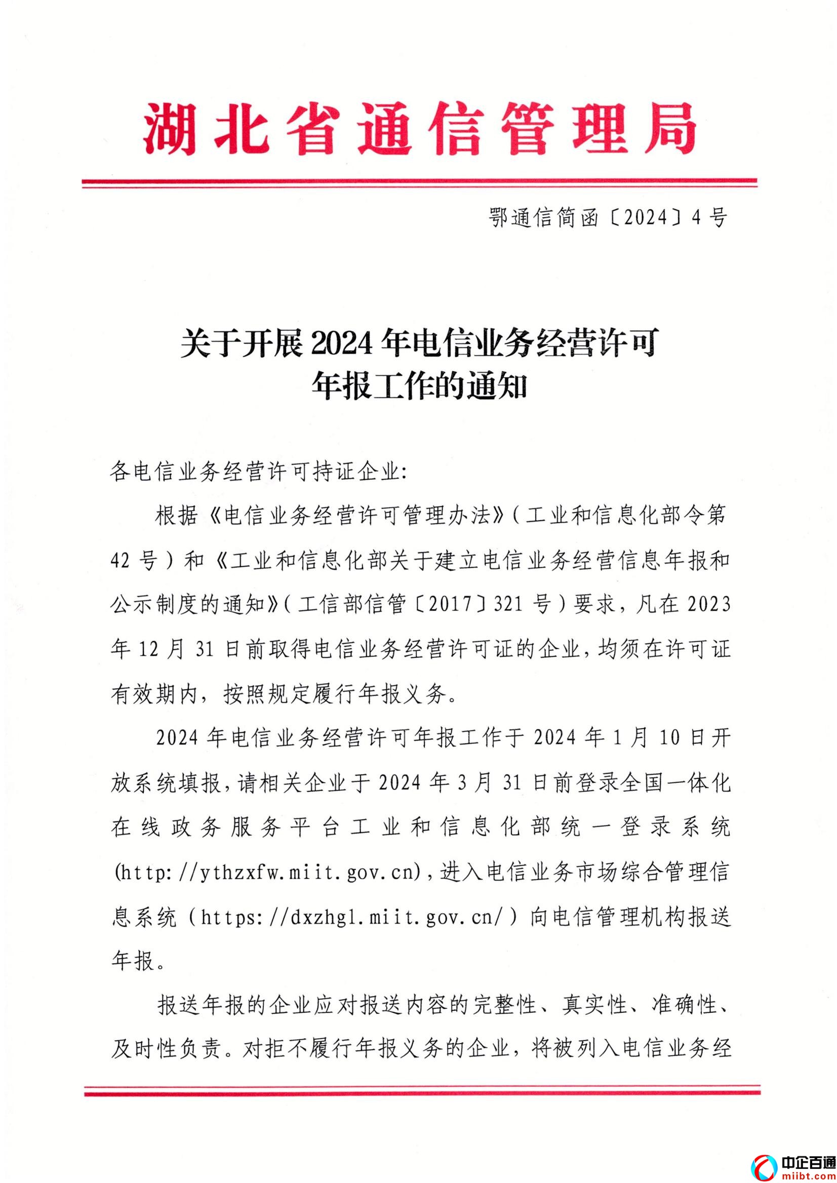 2024年1月11日,中企百通了解到,湖北省關于2024年增值電信業(yè)務許可證年報通知經通信管理QQ群對外發(fā)布,以下是文件詳細圖片,請查看。